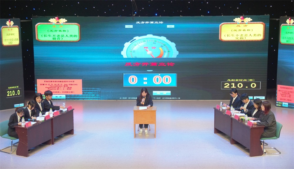 精于思、美于言,秀于心、慧于口。本次表演赛基于疫情防控的要求,采用线上线下相结合的方式进行,在演播厅设立比赛场地并邀请部分观众进行现场观看,并在钉钉上开设直播让更多的员工参与观看。在主持人刘馨怡上台对“长生不老对人类是福音还是灾祸”的辩题进行简要介绍并向在场观众介绍双方辩手后比赛拉开了序幕。在开篇立论的环节中张旭东同学作为正方代表首先发言,紧扣辩题,认为人类在保持年轻的基础上无限延长生命对于人才培养、人类发展都有着不可估量的积极意义。随后,反方四辩也根据正方所提出的观点进行精准的驳斥盘问,认为正方在思考问题时忽略了人口的无限增长所带来的资源短缺等实际问题,为反方一辩表达长生不老是灾祸的持方提供了良好的论证基础。进入自由辩环节,双方辩手更是各显神通,正方提到科学家等若可以长生不老则能够为社会发展持续供能,自然对人类是福音,反方也根据“江山代有才人出”、“一个萝卜一个坑”等现实问题进行反驳,双方唇枪舌战、条理清晰为观众带来了一场精彩纷呈的表演赛。评委老师王传领以辩论爱好者、前辈的身份与在场辩手一起探讨辩题,并提出自己的独到见解,认为生命的价值不在于时间长短才能够表现出来,在有限的时间里一样可以不断升华自身价值,面对现场观众的疑问也进行了深刻的解答。