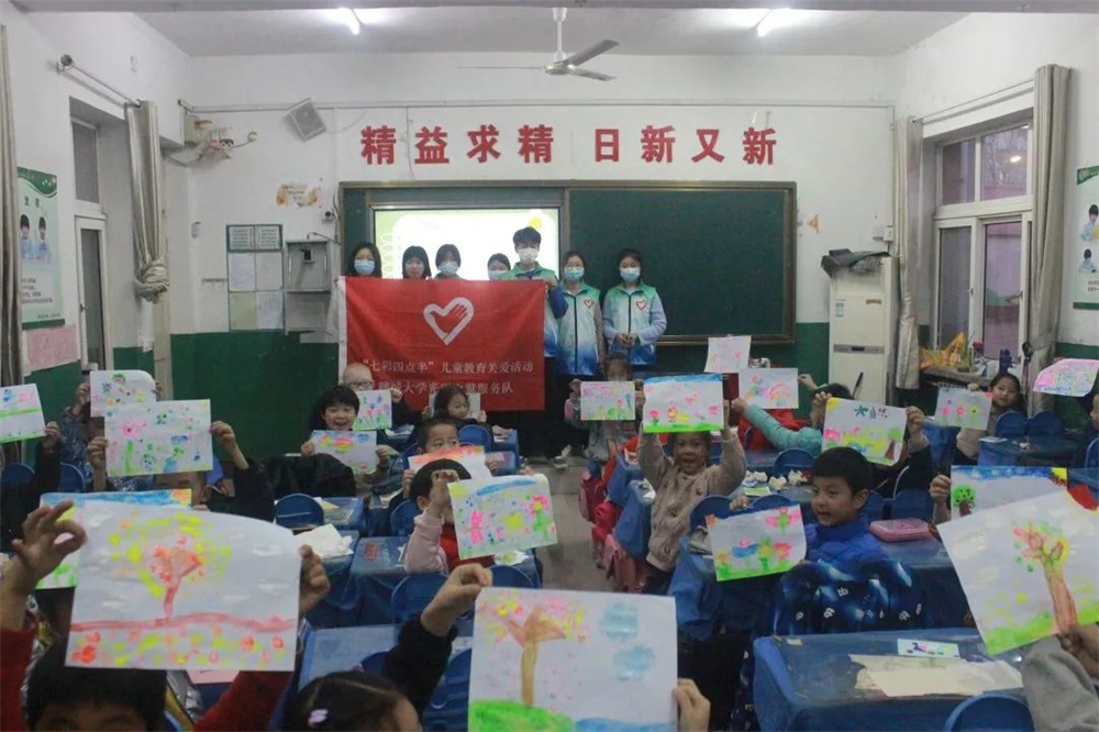 同学们向志愿者提出的各种问题,都一一得到志愿者的耐心解答。活动接近尾声,同学们在志愿者的帮助下完成了各自的创作作品,积极热情地上台向我们展示自己的绘画作品并与我们分享绘画的过程中的感悟,整个课堂充满温馨与温暖,活动在大家的合影留念中圆满结束。