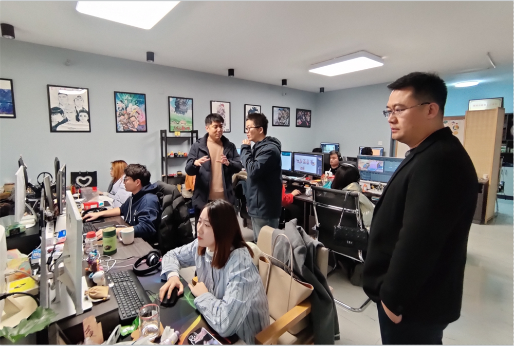 2月24日,郝翰与陈浩然作为学院代表来到山东省放牛班文化传媒有限公司看望实习员工刘鑫与冯文慧。老师对两位同学的工作情况进行了详细了解,刘鑫、冯文慧两位同学依次分享自己担任动画师一职的收获与感悟。实习单位领导表示,实习员工专业基础扎实,实践应用能力较强,能够积极开展实习工作,并对进一步打通拓展校企合作道路表示期待和肯定。