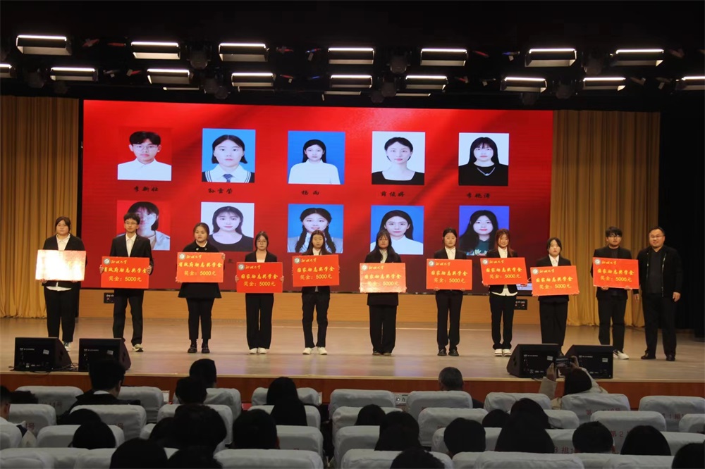 随后,主持人宣读获奖名单,颁奖仪式正式开始,由郭峰、赵勇、徐连荣、秦建波、郭玉真、郝翰、刘妙祎分别为国家奖学金和省政府奖学金、国家励志奖学金和省政府励志奖学金、省级及以上荣誉称号、英才奖学金、校级优秀员工干部、集体奖、校级单项奖学金颁发奖项。紧接着优秀员工代表丁振嘉、吴长乐、宋美璇依次上台发言,丁振嘉表示奖学金的设立不仅是一种荣誉,更寄托了学校和国家对老员工的殷切期望,也是同学们应当承担的一份责任和重托。吴长乐呼吁大家一起用实际行动来诠释人生价值。宋美璇作为优秀班集体代表发言,她带领班级取得了2023年度高校先进班集体的荣誉称号,她表示这份荣誉不仅是她们班级前进道路上的一个里程碑,也是一个新的起点。