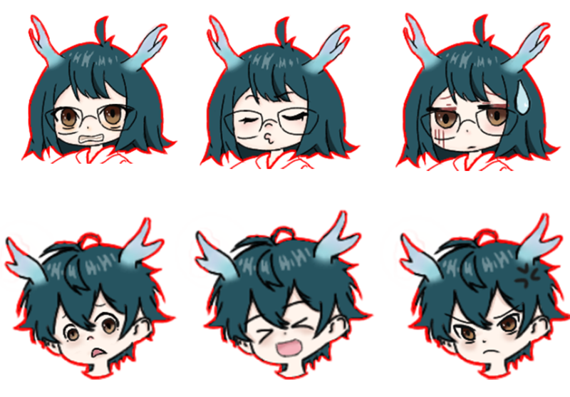 IP形象设计完成后,由刘纤纤根据该形象设计基础表情包,两个角色各设计了三款表情包,分别为尴尬、哼哼、流汗、惊讶、开心和生气,若反馈良好团队也将提供更多好用有趣的表情包。